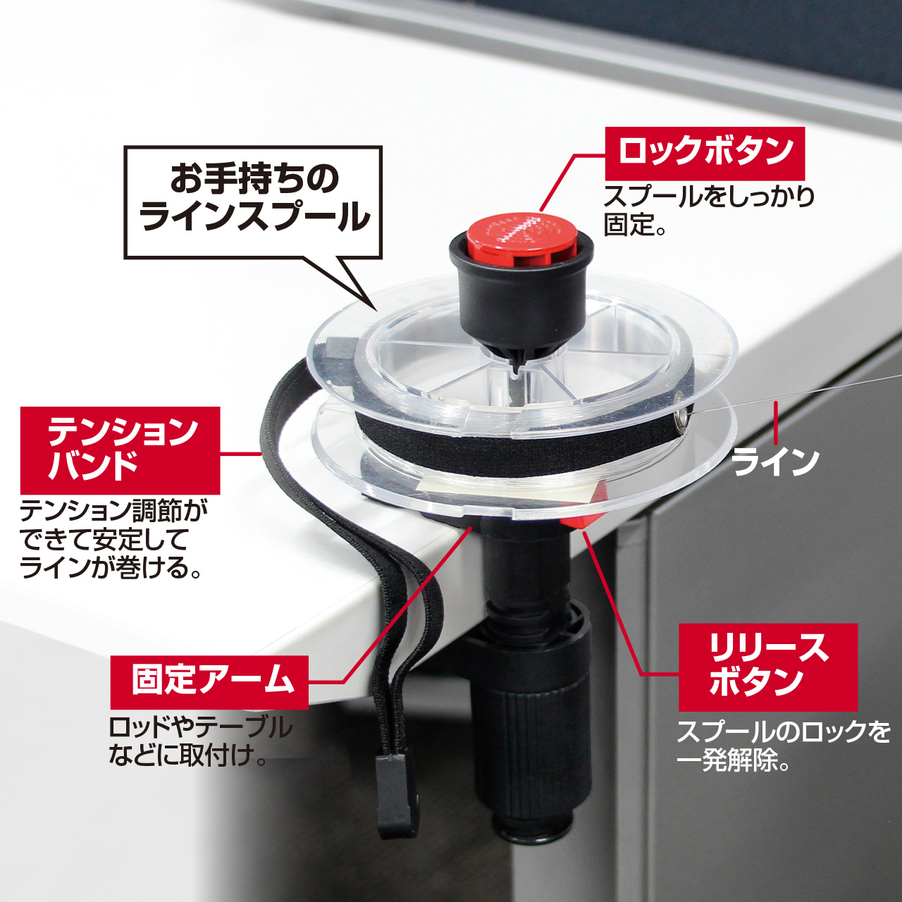 フィールドでのライン交換が簡単に可能なポータブルラインワインダー。 コンパクト軽量設計で、釣行時のバッグやタックルボックスに入れて持ち運び可能。 本製品をロッドやテーブルなどに取付けて、お手持ちのラインスプールを固定してラインを巻き取るだけ。 ベイト・スピニングどちらのリールにも対応。 安定してラインが巻けるテンションバンドやスプールのロックを一発解除できるリリースボタンなど多機能。