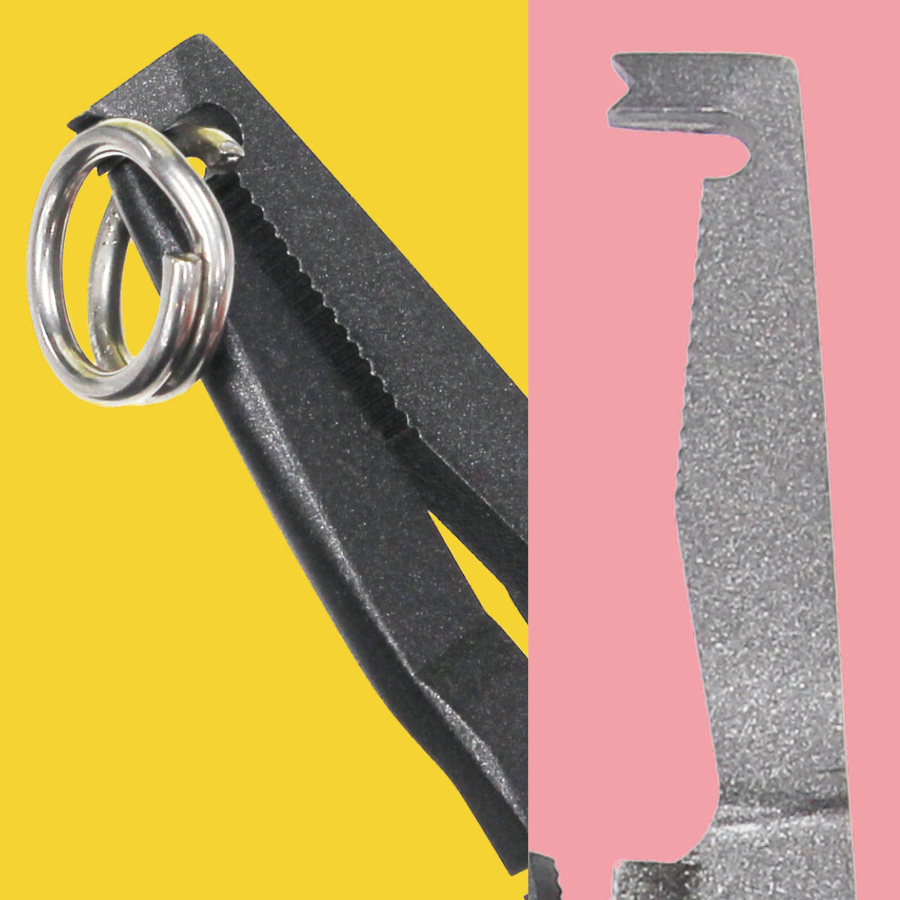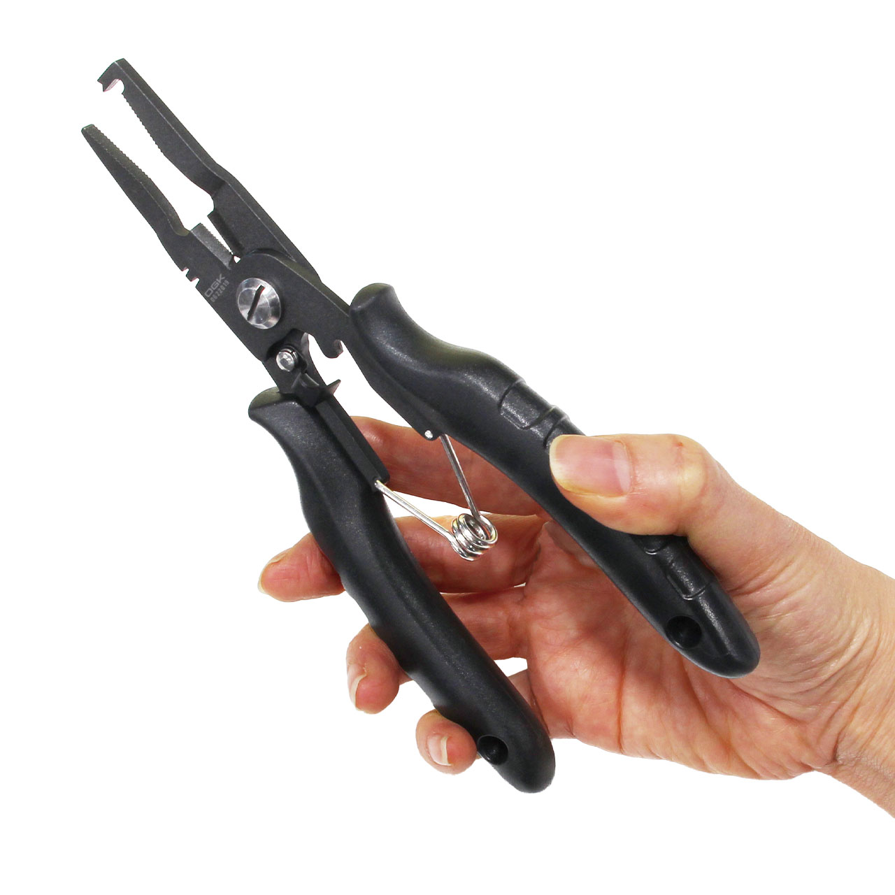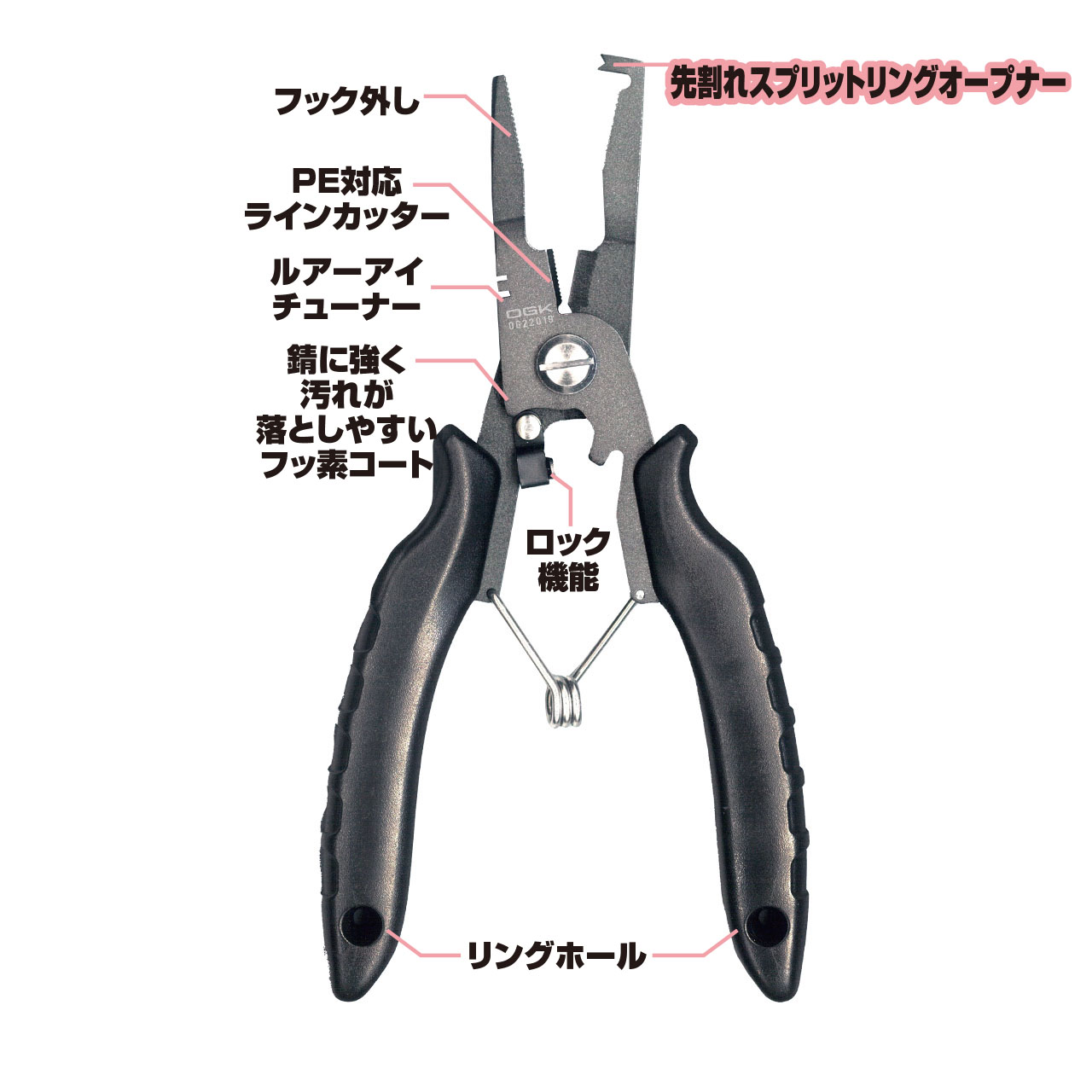 先割れスプリットリングオープナー採用のパワープライヤー。 スプリットリングオープナーの先端が先割れ形状のため、着脱しやすい角度にスプリットリングが開き、傷や変形も防止。リングサイズは、#10まで対応。 本体は、3Cr13ステンレス鋼錆にフッ素コート仕上げ。錆びに強く汚れが落としやすいのでお手入れも簡単。 他にも、フック外し・PE対応ラインカッター・ルアーアイチューナー・ロック機能・リングホールと多彩な機能。 オフショアなどパワーゲーム対応の多機能プライヤー。