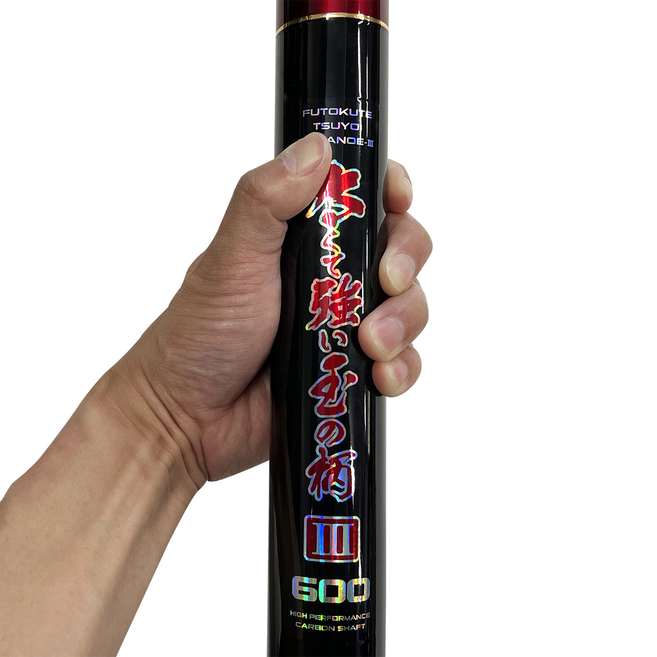 大型の回遊魚や巨鯉に対応するカーボン玉の柄。 玉口部分は口金リングで割れを防止。 ギャフとしても使用可能。 ショルダーベルト付。